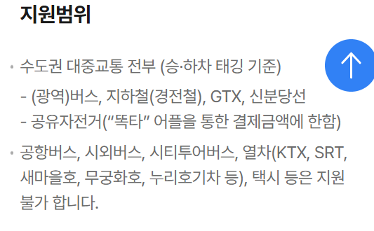 지원 신청일 기준으로 주민등록상 경기도에 거주하고 있어야 하며, 수도권 대중교통(광역버스, 지하철, 경전철, GTX, 신분당선 등)을 이용한 실적이 있어야 한다. 또한 ‘똑타’ 앱을 통해 결제한 경우에 한해 공유자전거 이용금액도 지원 대상에 포함된다. 반면, 공항버스, 시외버스, 시티투어버스, 고속열차(KTX, SRT 등), 택시 등은 지원에서 제외된다.