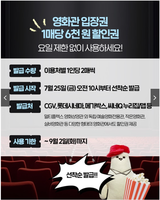 이번 기회를 통해 그동안 미뤄두었던 영화 관람 계획을 다시 세워보시는 것은 어떠신가요? 선착순 발급이니 7월 25일 오전 10시, 놓치지 마시기 바랍니다
